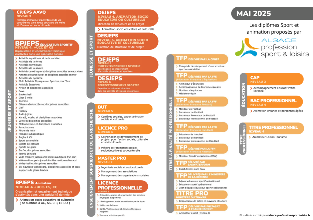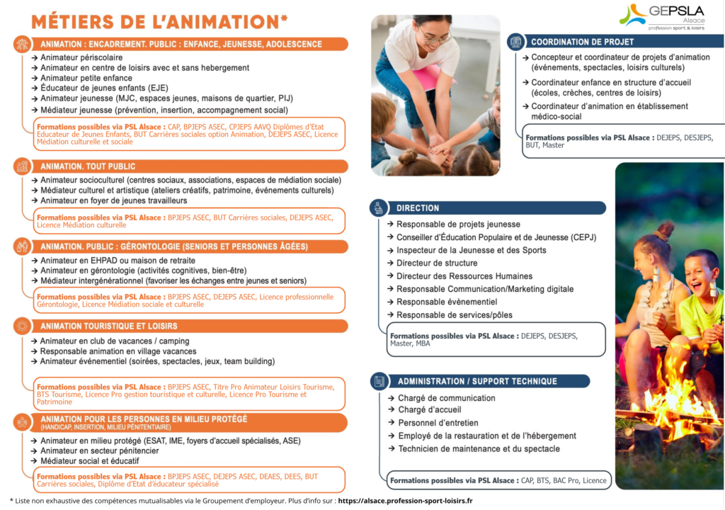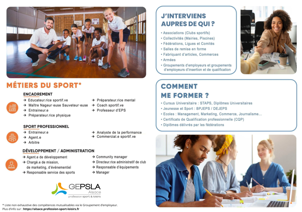 Chez PSL Alsace, nous pouvons vous accompagner sur tous les métiers et formations dans les secteurs du sport, de l’animation, des loisirs ainsi que les métiers de gestion et de support autour du secteur. L’éventail est plus large que vous ne le pensez. Retrouvez la liste ci-dessous :