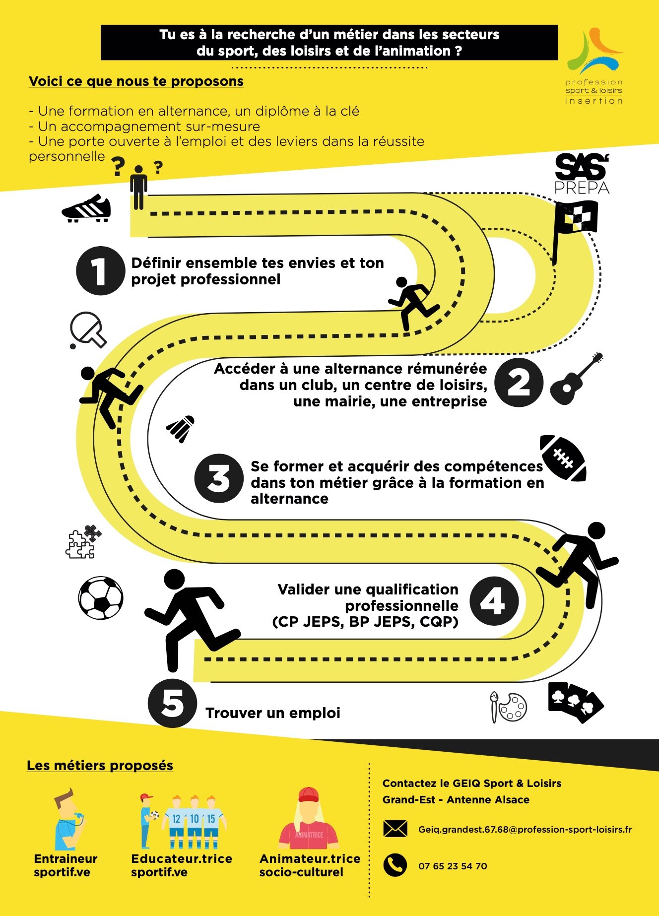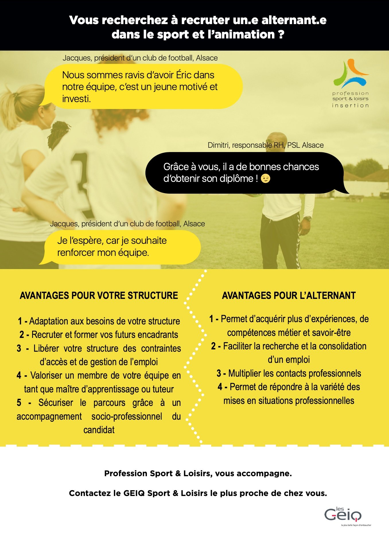 Il existe des GEIQ dans toutes les branches de métiers ; BTP, propreté, transport, culture, environnement, petite enfance, etc. PSL Alsace pilote le GEIQ Sport et Loisirs de la région Grand Est. Il est spécialisé dans les métiers du sport et de l’animation. Pour en savoir plus sur le réseau des GEIQ Sport et Loisirs, c’est par ici.